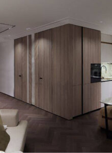 Стеновые панели могут быть выполнены в различных направлениях – классические варианты с багетами и объемными филенками, карнизами и резными балками, отделанные патиной и глянцевым лаком; это могут быть плоские или фрезерованные составные панели, с разной направленностью текстуры шпона, который сам по себе формирует естественный узор; это может быть чередование панелей и реек разных цветов и многое другое.