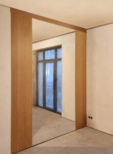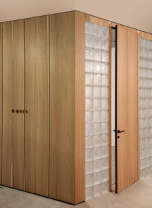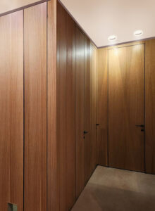 Стеновые панели могут декорировать двери скрытого монтажа в минималистическом стиле, или наоборот делать акцент на дверном проеме, ярко его подчеркивая.